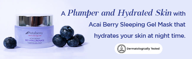 Astaberry Indulge Acai Berry Sleeping Gel Mask contains Acai Berry Extract and Bakuchiol which are rich in antioxidants. Bakuchiol serves a Retinol-like function to aid skin health with anti-ageing properties. This mask also contains Hyaluronic acid which deeply hydrates the skin and makes it look plumper and younger. This Sleeping Gel Mask is designed to work overnight when the skin rests.
