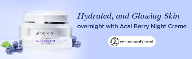 Astaberry Indulge Acai Berry Night Cream contains Acai Berry Extract and Bakuchiol that are rich in antioxidants. Bakuchiol serves Retinol like function to aid skin health with anti-ageing properties. This night cream also contains Hyaluronic acid which deeply hydrates the skin and makes it look plumper and younger and is designed to work overnight when the skin rests.